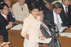 Nishimura posed questions regarding the expected economic benefits of “The Special Allowance for Childrearing” included in the supplementary budget, as well as the basis on which the proposed beneficiaries and amount of allowance to be paid had been determined. Minister of Finance Kaoru Yosano replied regarding the economic benefits: “It is not by any means a large amount, but we calculated that it would be a policy that would give some kind of support,” but did not give any precise estimate of the economic effect of the policy. Minister of Health, Labour and Welfare Yoichi Masuzoe explained the rationale for the proposed amount of the benefit, saying, “The basic amount of daycare charges paid by households who are not subject to pay residents’ tax is 6,000 yen per month, so we will provide half that amount, that is 3,000 yen per month. 3,000 yen times 12 months comes to a total of 36,000 yen per annum.”