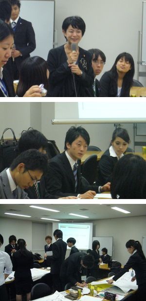午後は「政党スタッフの仕事ガイダンス」のあと、「若者と政治」に関するワークショップが行われ、若者の政治への関心を高めるために、@民主党は何ができるか、A学生は何ができるかをテーマにグループ討論を行ない、グループ別に発表を行った。